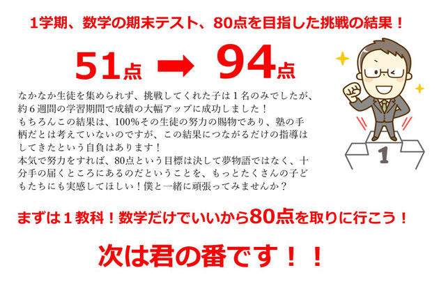 当塾で数学80点という目標に挑戦してくれた生徒、今回は1名のみでしたが、結果は何と!